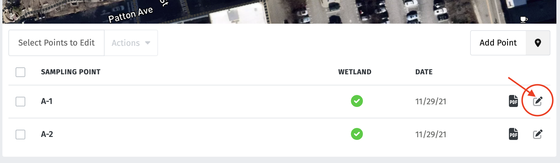 - To modify an individual point, scroll to the list of sampling points beneath the map, and select the editing icon.