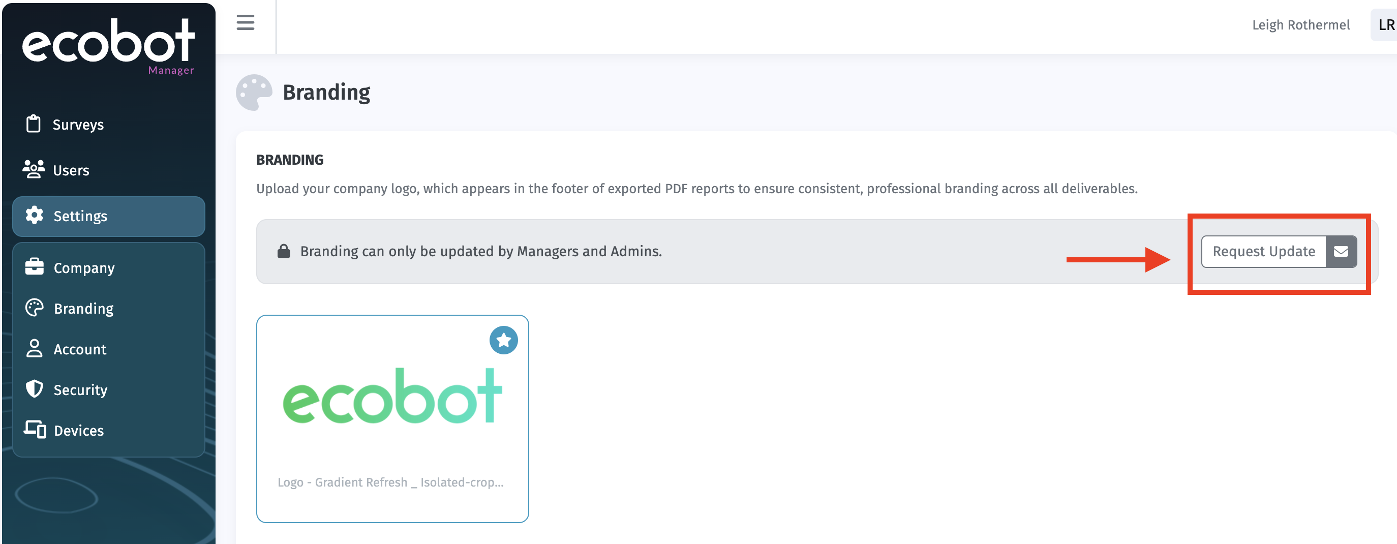 The Branding section allows Managers and Admins to upload and manage logos associated with your account.